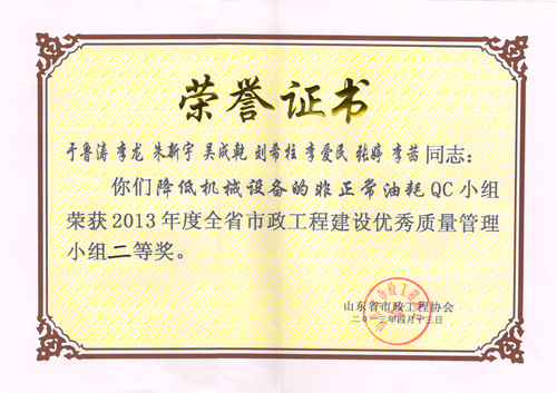 “降低機械設備的非正常油耗”QC小組榮獲2013年度全省市政工程建設優秀質量管理小組二等獎